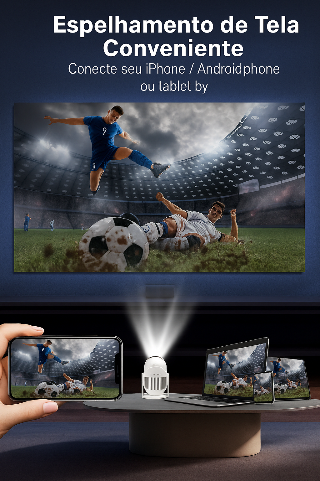 "Em 5 minutos transformei a sala num estádio para ver futebol com os amigos. A experiência é completamente diferente — parece que estamos mesmo lá!"
